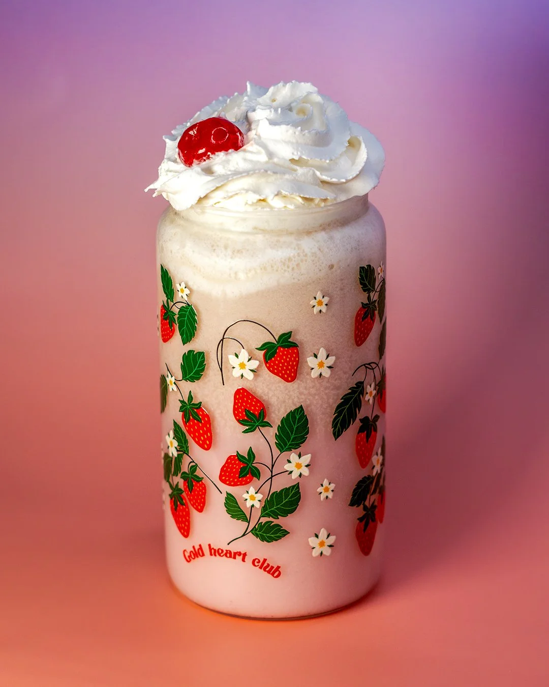 Une canette en verre ornementée de fleurs blanches et le texte 'wild heart club' sur fond rose, avec un liquide brun clair étant versé dans le haut de la canette.